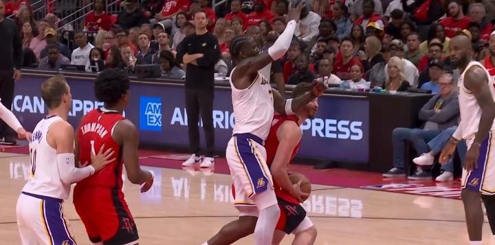在第三节比赛中段,湖人已经被火箭压制拉开落后20分左右差距。艾顿在内线防守申京时,他直接挥肘打中申京的脖颈部位,也是导致申京脸部变形。
